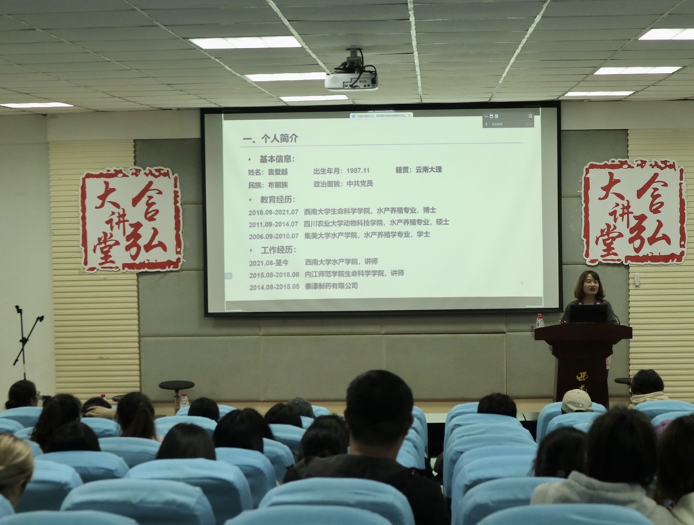 徐红艳老师以“二十年从研路: 不忘初心,砥砺前行”为主题,讲述了自己从研20年的经历。徐老师从新加坡国立大学忙碌又充实的求学之路开始,再到华东理工大学研究产重组HCG蛋白动物细胞株的构建以及大黄鱼对弧菌感染的免疫应答机制,最后来到永利3044集团官网开展科研教学,长期致力于水产动物遗传育种技术、生殖干细胞发育机制与培养应用研究。她鼓励同学们,“科研的道路是艰苦的,要坐得住“冷板凳”,理论和实践成果的取得都要耐得住寂寞。只有潜心钻研,才能迸发出创新的火花,“厚积”方能“薄发”。希望同学们在学习研究的路上一定要有不怕困难、勇于创新、潜心科研的信念。”