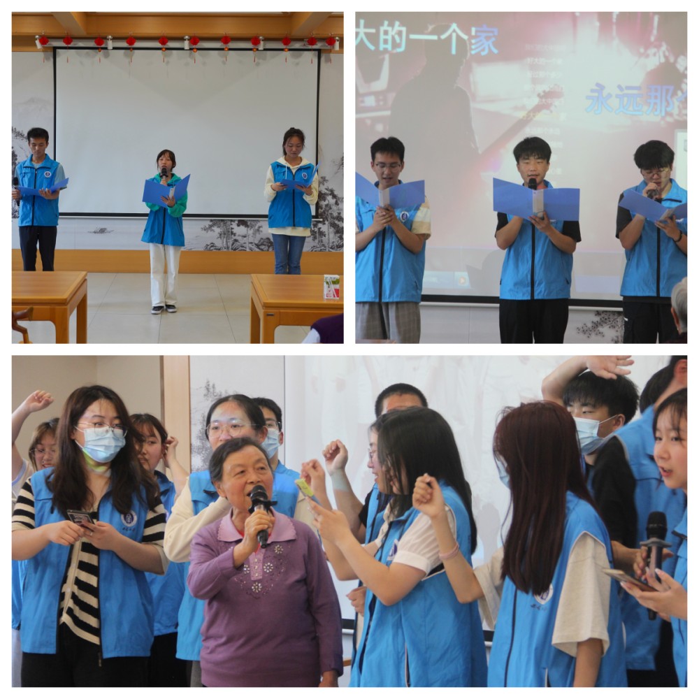 六十还青年,七十正当年。志愿者们合唱《我和我的祖国》,老人们英气不减当年,登上舞台和志愿者们一起歌唱,音乐声飘扬中,志愿者走向老人身旁,与他们扺掌而谈,合影留念。