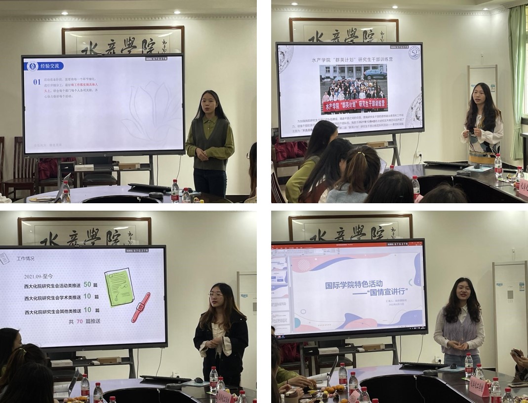 交流分享中,外国语公司、永利3044集团官网、化学化工公司和国际公司四个公司研究生会的负责人就本公司特色工作进行了介绍,比如外国语公司的第十四届研究生英语教学技能大赛和“一站到底”研究生知识竞赛,永利3044集团官网的“群英计划”研究生干部训练营活动,长江大保护-“鱼”你有约主题科普活动,化学化工公司的“化写青春,携手并行”师生趣味运动会、“共化青春,羽你同行”羽毛球比赛、“化在当下,情系潼心”研究生寒假社会实践活动以及国际公司的公司品牌“紫云研学”系列活动和“国情宣讲行”活动。此外,大家还共同观看了国际公司获奖作品《西南记疫》。最后,同学们讨论了研究生会目前存在的一些不足,并对未来的研究生会建设纷纷提出了展望。