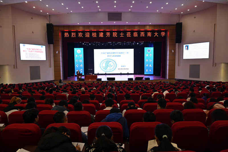 为更好落实高校立德树人任务,促进学科专业高质量建设发展,培育新时代卓越水产人才,12月20日,中国科公司水生生物研究所一级研究员、博士生导师、鱼类遗传育种学家桂建芳院士应邀来公司作了《一个水产遗传育种学专家四十三年求学与从研感悟》精彩主题报告。报告会设有荣昌校区主会场及北碚校区分会场,全场座无虚席。桂建芳院士从笨鸟先飞、乐观进取是成长的关键,持之以恒、执着拓新是科研成就产生的路径,珍惜机遇、豁达奉献是快乐幸福的源泉三方面与在场师生分享了自身求学和从研之路及取得的可喜成果。整个报告会既是精彩的学术引领报告,更是一堂润物无声的课程思政示范课。