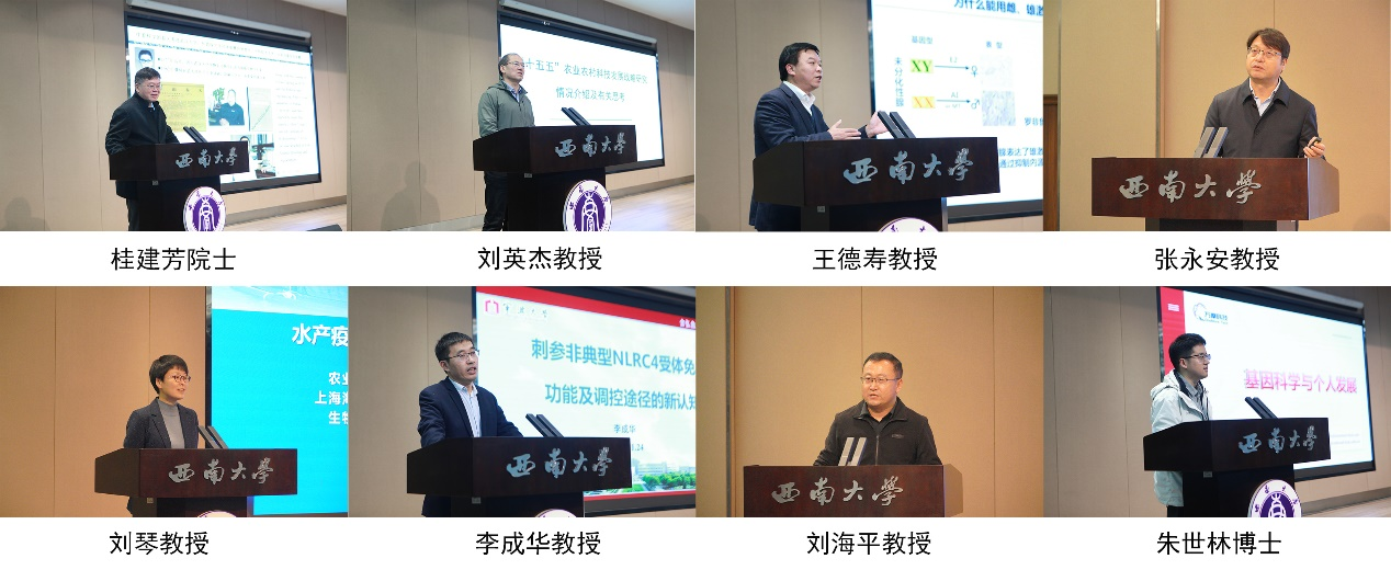 开幕式结束后,桂建芳院士作了题为“多倍体鲫属复合种的遗传基础解析与育种技术创新”的大会特邀报告。报告中,桂院士详细介绍了多倍体鲫独特的遗传特性、精准育种的挑战以及最新的技术创新成果,为与会者提供了宝贵的学术启发。随后,刘英杰教授、王德寿教授、张永安教授、刘琴教授、李成华教授、刘海平教授、朱世林博士分别以“十五五农业科技战略研究及相关思考”“罗非鱼经济性状遗传解析与基因编辑新种质创制”“草鱼B细胞的免疫功能和分化路径”“水产疫病免疫综合防控技术探索”“刺参非典型NLRC4受体免疫功能及调控途径的新认知”“新西部大开发视域下水产学科发展和思考”“基因科学与个人发展”为题的主题报告。永利3044集团官网经理刘海平教授、科技处副处长徐洛浩教授主持学术报告环节。