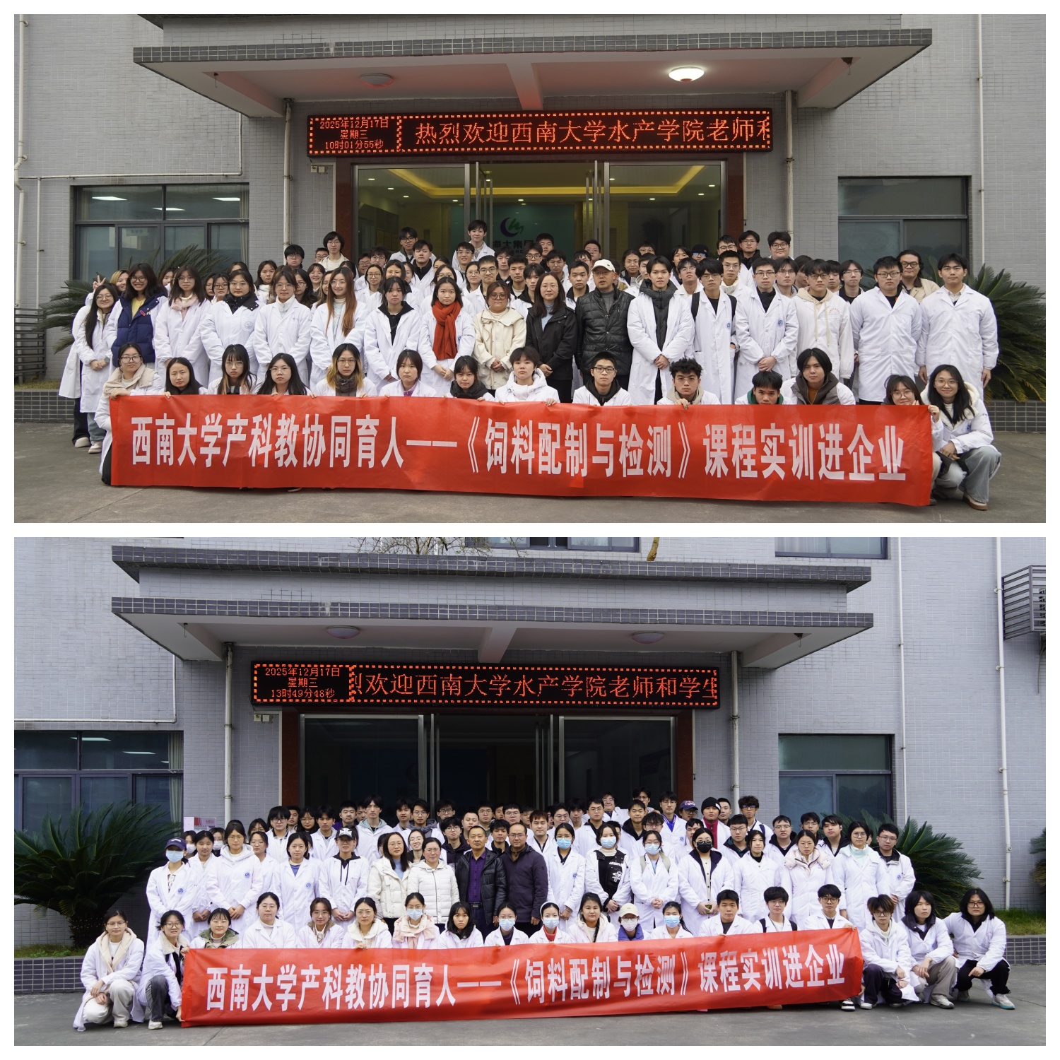 为深化“产科教”协同育人机制,推进“水产动物营养与饲料学”“水族营养与饲料学”“饲料配制与检测”“饲料分析与质检”等课程理论教学与产业实践深度融合,12月17日,在向枭、罗辉、林仕梅、王文娟四位任课教师的带领下,公司2023级本科生前往重庆海大饲料有限公司开展课程实训。通过沉浸式参观饲料生产全流程、深度聆听企业发展分享,同学们在实践中筑牢专业根基,在交流中明晰未来方向。